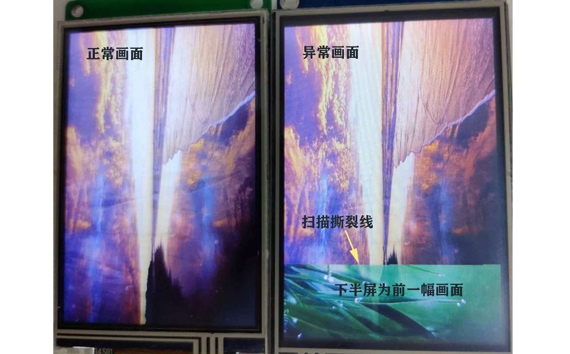 如果CPU刷屏速度不夠快,在切換畫面過(guò)程中,人眼會(huì)明顯看到畫面由上到下的變化,會(huì)在畫面上同時(shí)呈現(xiàn)前后兩幅畫面,在兩幅畫面交接的地方就會(huì)看到畫面被撕裂一樣的線條。由于3.5寸等小尺寸屏幕的像素顆粒大,使得畫面撕裂線非常明顯。目前市場(chǎng)上的3.5寸及以下串口屏,普遍都存在這種現(xiàn)象,特別是3.5寸320*480分辨率的串口屏最為嚴(yán)重。
